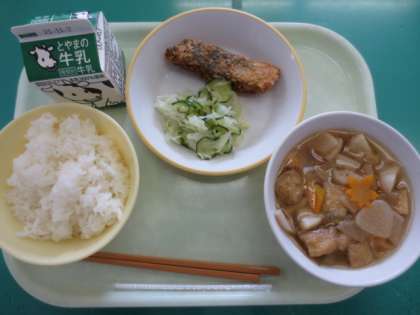 10月26日の献立は「ごはん、牛乳、魚の竜田揚げ、そえ野菜、根菜汁」です。
