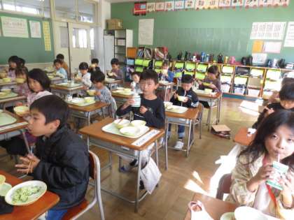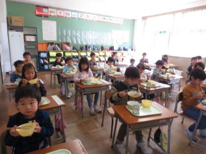 今日は1年1組の様子です。食事中は、とても静かでよくかんでいました。残さず全部食べキリンです。