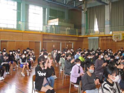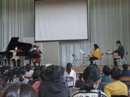 本日、学校コンサートが開かれました。管・弦楽器を紹介してくださったり、子供たちになじみのある曲や、自分たちでストーリーを選択して想像を膨らませていく曲を演奏してくださったりするなど、音楽の世界に浸る時間となりました。