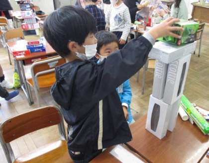 算数科「かたちあそび」では、身の回りの空き箱や空き容器を使って、立体図形に親しんでいます。