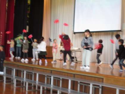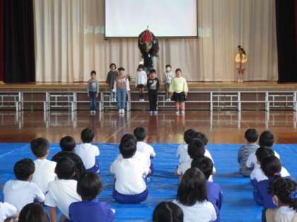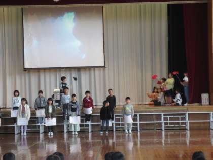 1時間目は、2年生の発表を1、3年生が鑑賞しました。「歌声や演技が上手だね」と感想を伝えていました。