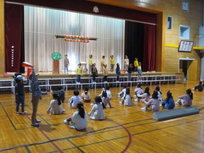 かわいい動物たちになりきっている1年生。その様子を、上級生が順番に観覧し、演技に大きな拍手を送っています。
