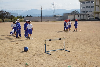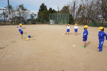 体育科では、ボールを蹴る練習をしています。色団の友達にパスをしたり、的に向かって蹴ったりしながら、狙った場所に蹴るためのポイントを考えています。
