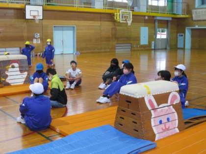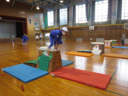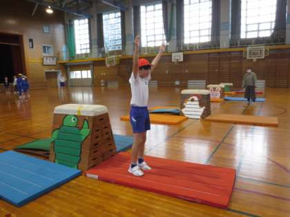 6年1組のとび箱では、手をつく位置や跳ぶ姿勢など、よりきれいに跳ぶ学習を進めています。次に跳ぶ人とぶつからないように、「とんだ後、3秒間決めポーズをする」という約束もあります。