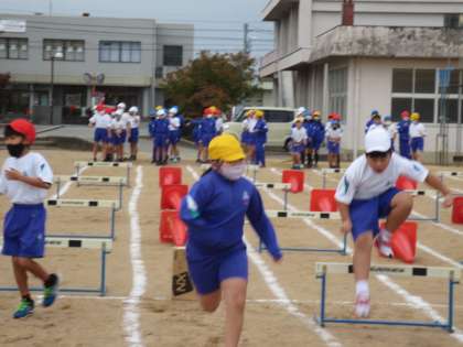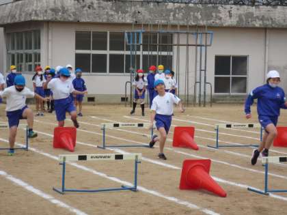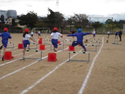 ハードル間を5m、5.5m、6m、6.5mに設置し、自分の跳びやすいインターバルを選んでリズムよくハードルを跳び越します。