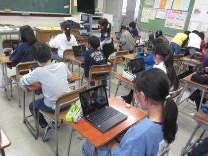 社会科では、富山市八尾町、高岡市に注目して、富山県の伝統文化について学習しています。実際の動画や写真、時には実物の工芸品を見ながら、子供たちは実感を伴った学習を進めています。
