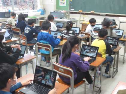 写真は1組の様子です。クロムブックで高岡銅器について調べています。
