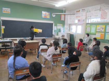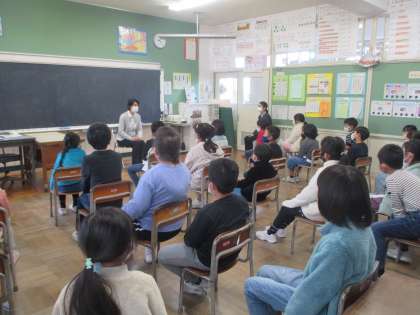 富山市立図書館の方々に読み聞かせをしていただきました。絵がなく、耳で聞くお話や、2年生に合ったとてもおもしろい本等、初めて聞いたり見たりするものばかりで、とても興味津々で聞いていました。読んでいただいた本は1ヶ月貸していただけることになり、さっそくたくさんの子供たちが本を読んでいました。