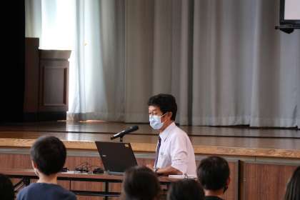 学校眼科医の水野先生、学校内科医の越村先生、学校薬剤師の蔵本先生にお越しいただき、メディアの利用が心身の健康にどのように関係しているか、これからどのようなことに気を付けたらよいかについて、分かりやすくお話をしていただきました。