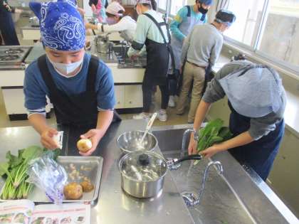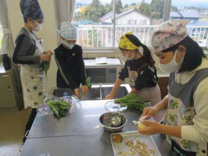 5年生では家庭科の学習で調理実習を行っています。今日は5年1組が青菜のおひたしとゆでいもをつくりました。初めて調理をする子もいて、慣れない手つきながらも安全に気を配り、友達と仕事を分担しながら進めていました。5年2組は、水曜日に行います。