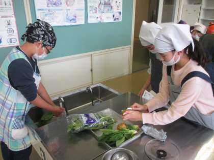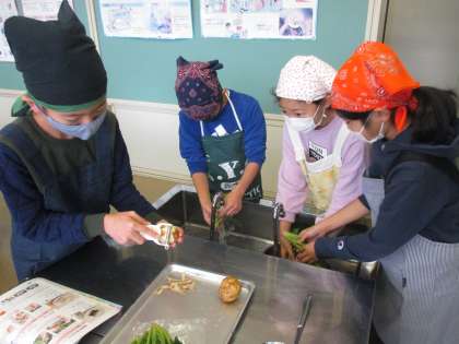 5年1組の調理実習の様子 その3です。仕事を分担し、効率よく作業を進めています。