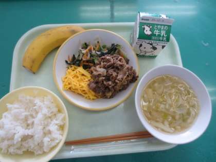 12月2日(木)の献立は、「ごはん、牛乳、ビビンバ(焼き肉、ナムル、錦糸卵)、みそ汁、バナナ」です。