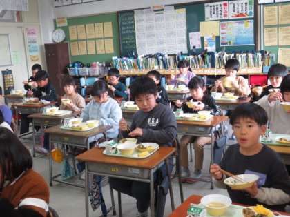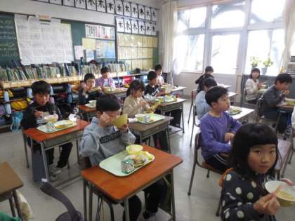 3年1組の様子です。ビビンバにするとご飯がよりおいしく感じられるようで、もりもり食べていました。