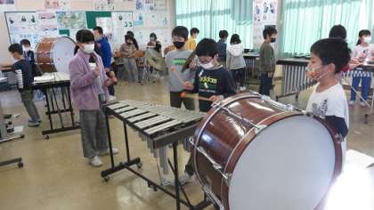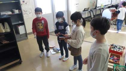 今日は、音楽の時間に「おかしのすきなまほう使い」の楽曲に合わせて、まほうの音楽づくりをしました。4人ずつのグループに分かれて一人一人が好きな楽器を選び、魔法が成功した様子を思い浮かべながら、楽しく音楽づくりをしました。