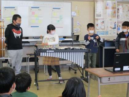 今日は、グループごとに考えた「まほうの音楽」を発表しました。発表した後には、リズムや奏法、楽器の組み合わせ等の工夫について話し合いました。どの子も楽しそうに聴き合いをしていました。