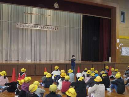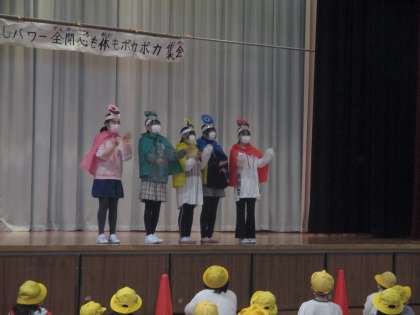 集会委員会主催の児童集会が開かれました。今日は、赤・白団の子供達が集まりました。