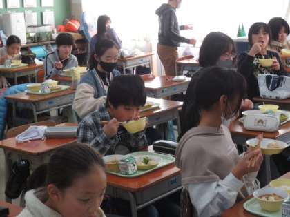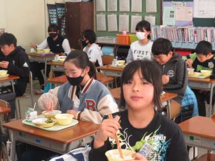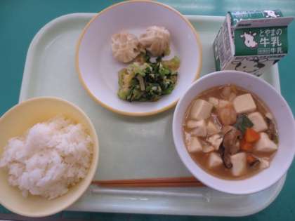 12月14日(火)の献立は「ごはん、牛乳、エビと豆腐のうま煮、ショウロンポウ、小松菜ひたし」です。6年3組でも、中華料理風のおかずに、ごはんが進んでいるようでした。