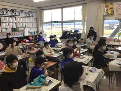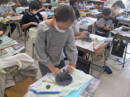 土粘土を使った作品づくりに取り組む図画工作科「水の流れのように」の学習は、講師の方をお招きして行いました。作業の工程や注意点を教えてもらった後、粘土をこねたり伸ばしたりしながら、自分なりの作品作りに挑戦しました。