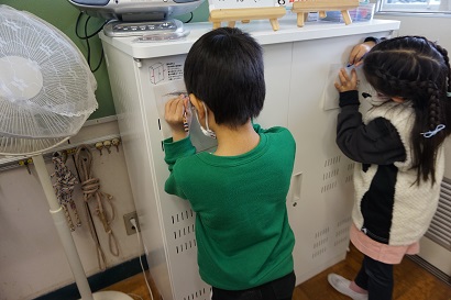 図画工作科「でこぼこはっけん」では、教室にある様々なでこぼこを見付け、こすりだして形を写し取りました。たくさんのでこぼこを見付けたり、形のおもしろさを感じ取ったりしていました。