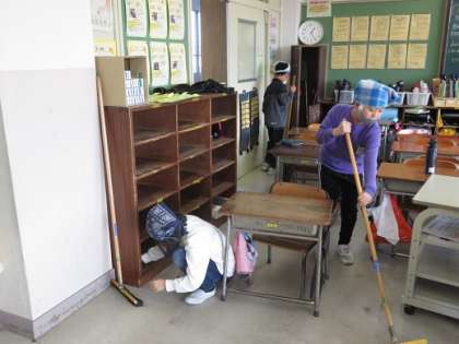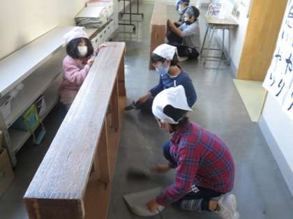 教壇や下足ロッカー等、普段の掃除ではできない所をぞうきんで丁寧に拭いたり、荷物の整理整頓をしたりと、どの子もぞうきんが真っ黒になるまでがんばって掃除をしていました。