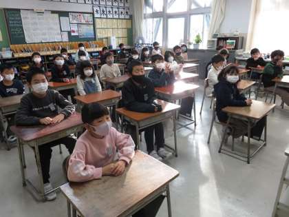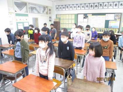 教室で校長先生のお話を聞いたり、他の学年の子供の「かがやき発表」を聞いて拍手を送ったりと、2学期を振り返りながら真剣に式に参加しました。
