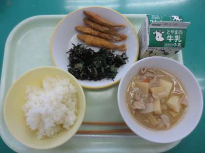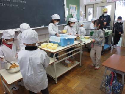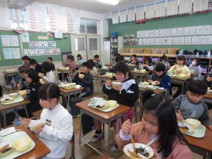 1月13日の献立は「ごはん、牛乳、わかさぎのフリッター、鶏肉とジャガイモの南蛮煮」です。今日は2年生の様子です。
