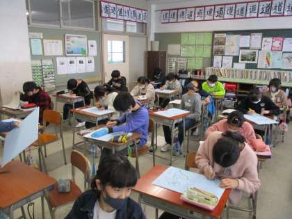 5年生では、版画の学習がスタートしました。自分の好きな話の場面を取り上げ、版画に表しています。彫ったあとの様子や完成した作品を想像しながら、丁寧に彫り進めています。