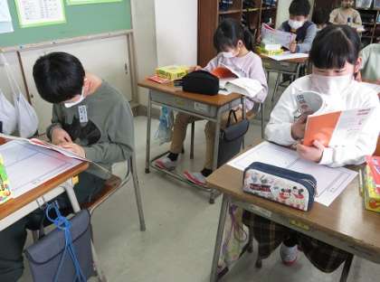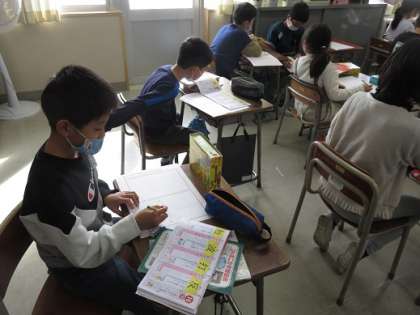 漢字一文字につき、音読みと訓読みの言葉を探し、それをつなげて文をつくりました。教科書や漢字ドリル、国語辞典などをじっくり見ながら、5・7・5のリズムで楽しく文作りを行いました。
