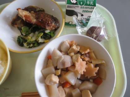 1月27日(木)の献立は「ごはん、牛乳、魚のねぎみそかけ、柚子昆布和え、炊き寄せ煮、おはぎ」と、日本昔話に出てきそうな和食の献立でした。炊き寄せ煮には、もみじの形のかまぼこが入っていました。お昼の放送では、栄養教諭から「たくさんの人が、安全でおいしい給食になるようにがんばっているので、感謝して食べましょう」とお話がありました。