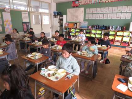 今日は、1年2組の給食の様子です。「おはぎ、おいしいね」「野菜、大好き」など、好評でした。