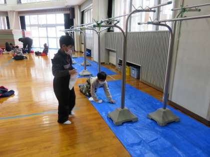退所式が始まる前に、トイレのスリッパを並べたり使わせてもらったブルーシートやホールの床を拭いたりと、しっかりと後片付けをする姿が見られました。雪遊びを思いっきり楽しむことと、マナーよく過ごすことのメリハリが付いたすてきな姿でした。