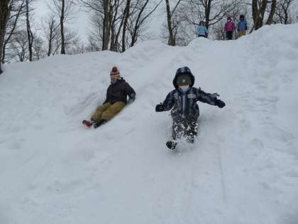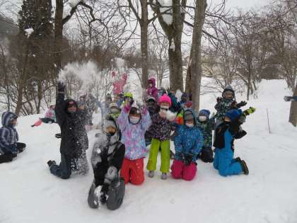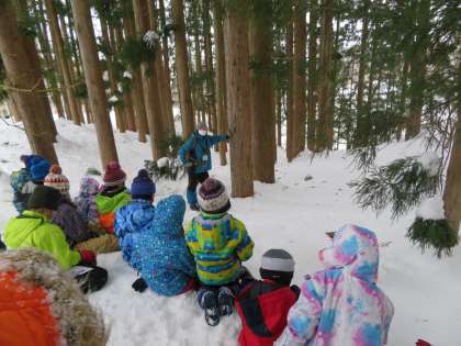 昼食後は冬の森探検に行きました。雪がちらついてきたため、はじめにトントンの森へ行き、しりすべりで森を下りました。途中できつつきが穴を開けた木やにおいのする木を楽しみました。