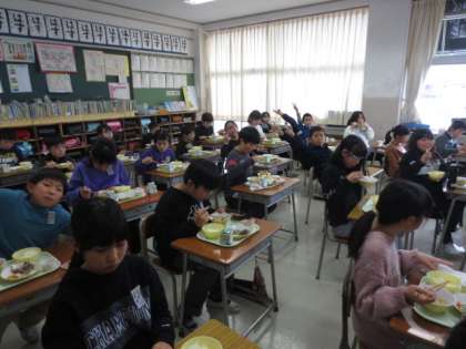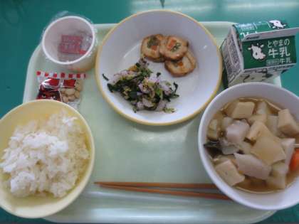 2月3日(木)の献立は「ごはん、牛乳、野菜の肉巻き、ゆかい和え、おでん、納豆、節分豆」です。春の訪れを待ちながら、節分豆をおいしくいただきました。