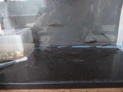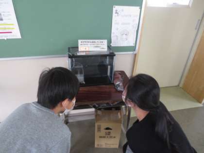 3年生が預かって飼育しているサクラマスは、卵からかえって元気に泳いでいます。卵はオレンジ色でしたが、稚魚は黒くてしましまの模様があります。もっと大きくなってほしいと大切に見守っています。