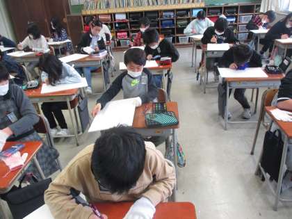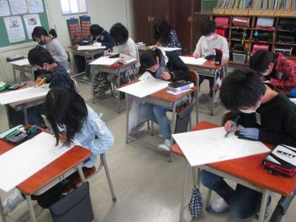 図画工作科では、版画の作品作りを進めています。パンダやカブトムシ等、生き物を描きます。彫刻刀を使うときは、安全に気を付け、集中して彫っていました。