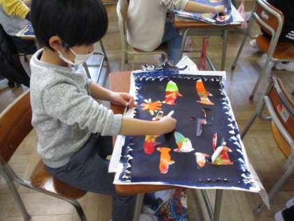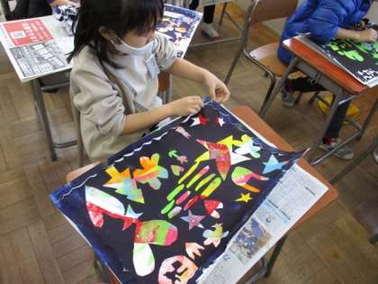 図画工作科でステンシルローラー版画に取り組んでいます。シールをめくると、下に塗った色が見えてきます。きれいな色が見えて、喜んでいました。