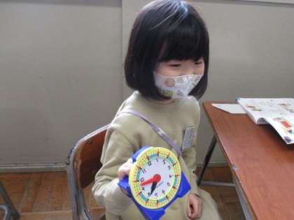算数科で、時計の読み方を学習しています。何時何分を表しているか考えたり、自分の時計で時刻を表したりしました。これからは、時計を見て時間を考えながら生活していきます。