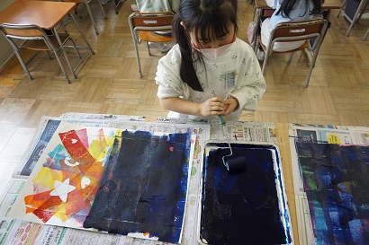 図画工作科で、シールを貼った台紙を黒色や藍色で塗りました。塗り残しのないように、慎重にしました。来週、シールをはがすのが楽しみです。
