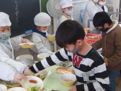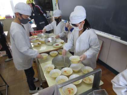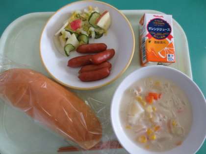 2月16日の献立は「米粉コッペパン、オレンジジュース、ウインナー、白菜とリンゴのサラダ、コーンチャウダー」です。