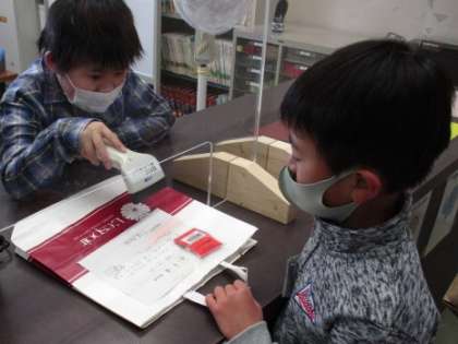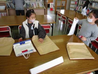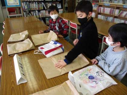 今日は、図書室に本の福袋が置かれているので、図書室に足を運ぶ子が多くいました。どんな本が入っているのか楽しみにして、袋を選んでいました。