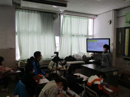 国語科では、「この本おすすめします」という学習で、自分のおすすめの本をクロムブックで紹介用のスライドを作りました。相手に伝わりやすいように話をしたり、見やすいスライドを作ったりしました。