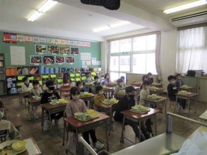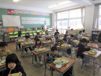 写真は、1年生の様子です。配膳が終わるまで静かに待ち、食事中もお話をしないで食べています。