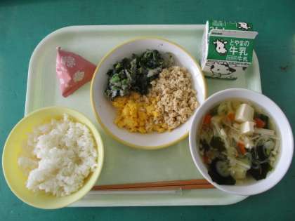 2月24日の献立は、「ごはん、牛乳、そぼろ丼(鶏そぼろ・炒り卵)、よごし、すまし汁、ひなあられ」です。春の香りがする献立です。