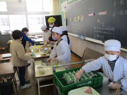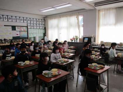 写真は、2年生と3年生の様子です。しゃべらず手際よく配膳し、全員の配膳が終わるまで座って待っています。