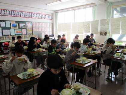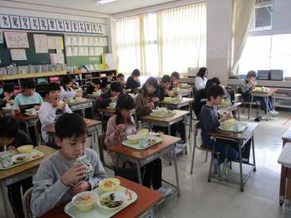 写真は、4年生と5年生の給食時間の様子です。放送では、卒業をお祝いする放送が始まっています。下級生から6年生へのメッセージが紹介され、静かに耳を傾けていました。