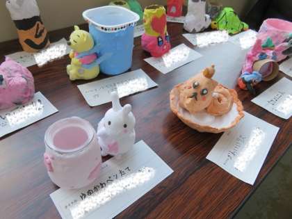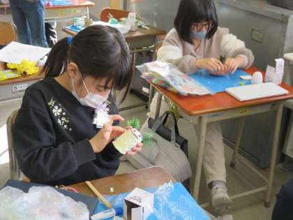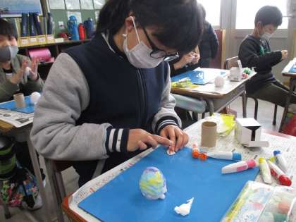 図画工作科では、空き容器や卵型ライトに紙粘土をつけて、すてきな小物入れや置物に変身させる学習を行いました。どの子も工夫しながら楽しく作品づくりに取り組みました。