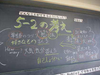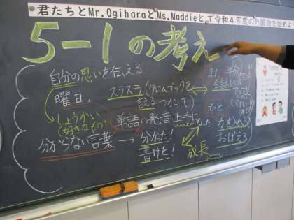 外国語の授業がスタートしました。今回は、4年生の学習を振り返り、5年生ではどんなことができるようになりたいかを発表し合いました。
