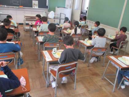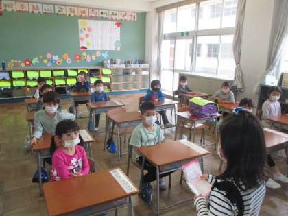 今日は入学して初めて、掃除をしたり給食を食べたりしました。自己紹介も、ドキドキワクワクしながらしっかりできたね!