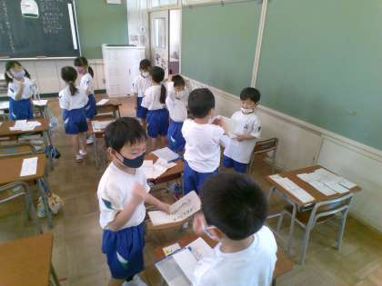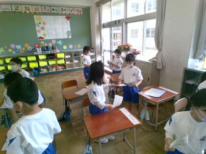 国語科では、家で一生懸命書いてきた「名前カード」を使って自己紹介をしました。たくさんの友達と交換することができました。