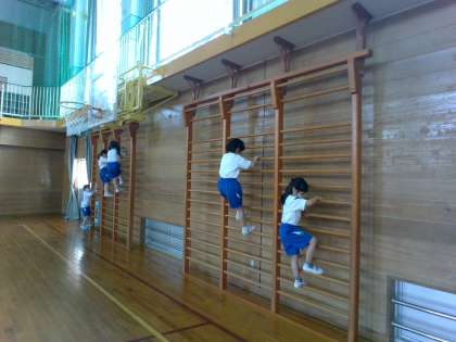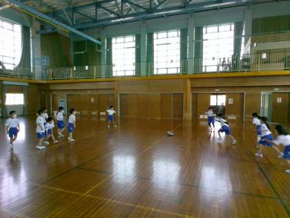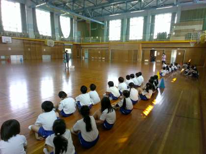 体育館での体育の授業の後、休み時間の体育館の使い方について話を聞きました。その後の休み時間に、早速体育館で遊びました。
